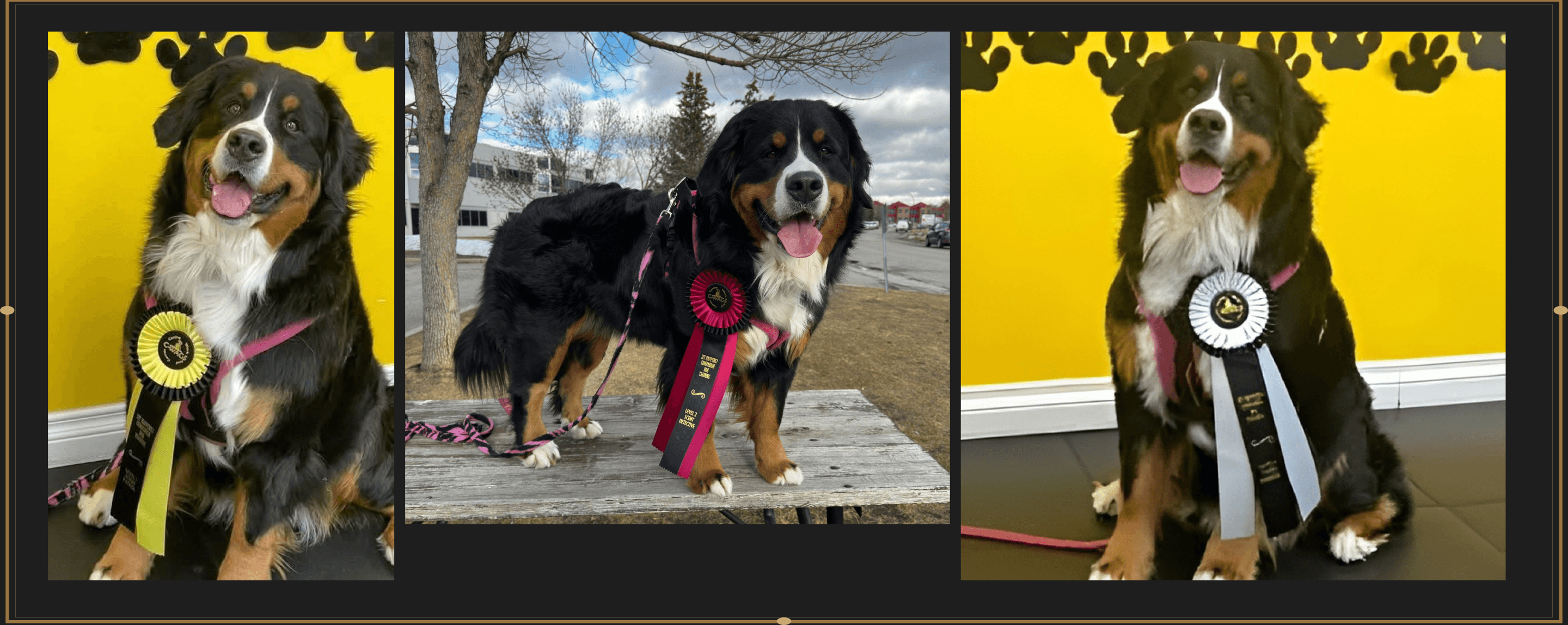 Among his many achievements, Takoda holds the distinction of being the first dog in Canada to earn the Master Draft Dog Excellent (MDDX), and the first Bernese in Canada to earn Scent Detection Master (SDM), Scent Detection Grand Master (SDGM), Trick Dog Grand Champion (TDGCH), and Versatility Gold (VG) titles.